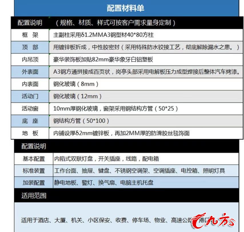 1、钢结构岗亭是工厂化制作好的成品钢结构活动房,镀锌钢管为主结构框架,采用环保墙体维护材料,外墙氟碳漆喷漆或金属雕花板及其它外墙装饰材料,可定制不同规格及形状的产品。